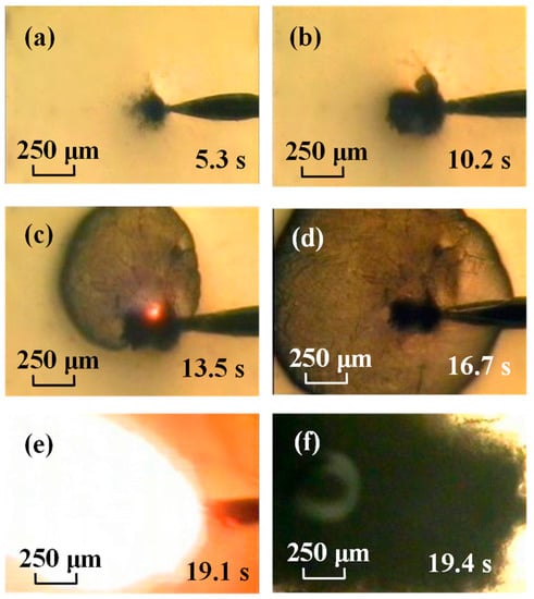 Bubble-treeing breakdown phenomenon under a 7.8 kV voltage at 130 kHz: (a) Bush-like tree generated after tree initiated; (b) Bubble generated within the tree; (c,d) Bubble expanded rapidly; (e) The increasing bubbles reached the grounding electrode with a strong discharge arc; and (f) The sample broke down.