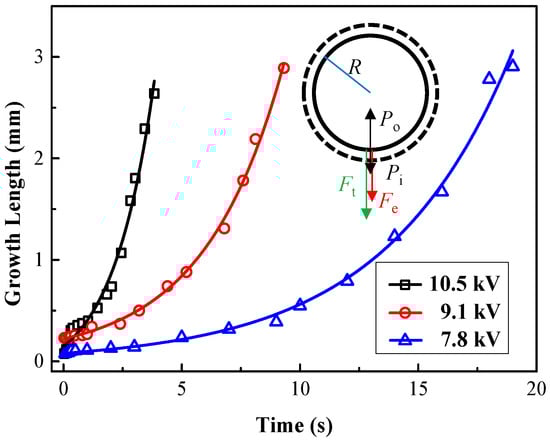 Figure 8 shows the increases in the radii of the bubbles (R) upon the application of AC voltages with different magnitudes. As time increased, R increased exponentially. As the voltage increased, the growth rate also increased. The time from tree initiation to breakdown is within several seconds: about 3.84 s at 10.5 kV, 9.32 s at 9.1 kV, and 19.1 s at 7.8 kV (for all cases, the applied voltage frequency was 130 kHz).