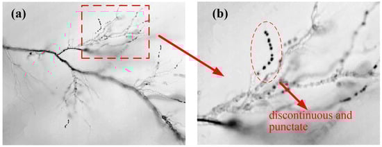 Enlarged pictures of electrical tree channels: (a) Transmission light image of electrical trees (upon application of 10-kV voltage at 50 Hz for 5 min); (b) Partial enlarged image of Figure 9a.