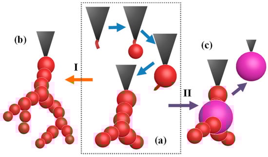Growth model for electrical tree in SIR at different frequencies: (a) Electrical treeing initiation; (b) Trees growing under lower frequencies []; (c) Bubble growing under frequencies greater than 100 kHz.