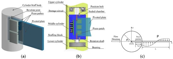 Underwater mooring platforms are tethered to the seabed using tens or hundreds of meters of mooring cables. Inspired by the above research, when a bluff body is covering the mooring cable, kinetic energy contained in vortices shed from the bluff body could be recovered through piezoelectric materials. A vortex-induced piezoelectric energy converter (VIPEC) for mooring cables is then designed as shown in Figure 1a. The VIPEC is intended to be affiliated to existing underwater mooring cables. It can be used to charge a storage battery and is beneficial for sustaining the cables’ stability. Furthermore, with the mooring cable as its foundation support, the VIPEC can be easily cascaded along the cable and scaled in size. The converter is mainly composed of a bluff body, a pivoted plate and several piezoelectric patches, and a storage circuit. When shedding vortices act on the pivoted plate, they squeeze piezo patches and convert fluid kinematic energy into electricity; generated electricity is collected through the storage circuit. Detailed mechanisms will be discussed in the following part.