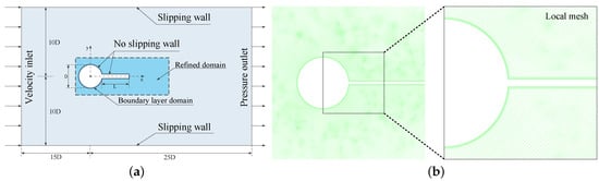 For the convenience of comparing with others’ simulated and experimental results, CFD simulation verification and validation in this paper was processed under flow past a smooth cylinder at . A grid convergence study was performed to evaluate the influence of grid resolution on the lift coefficient , the drag coefficient , and Strouhal number . Three different grid resolutions, whose total elements were controlled by max face size, and their calculated results are listed in Table 1. Because most elements were aggregated in the neighborhood of the model (the refined domain in Figure 2a), results of medium and fine grid cases had little difference. It can be noted that medium and fine girds gave substantially the same results and agree well with large eddy simulation (LES) results given by Catalano et al. [], and published experimental data []. Considering time consumption in the simulation, the medium grid resolution was adopted in the following simulations.