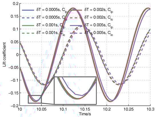 Verification of the lift coefficient with different time steps ( is the time step; and is the lift coefficient on the plate and the cylinder, respectively).