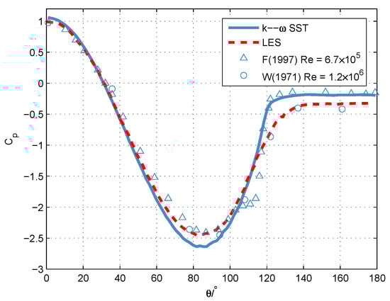 In order to validate the accuracy of the turbulent model adopted in this paper, the calculated pressure coefficient around the cylinder at is showed in Figure 4. It can be found that the simulation result agrees well with that of LES [], Falchabart’s [] and Warschauer and Leene’s [] experiments, which means reliable results of this issue can be obtained from the adopted turbulent model.