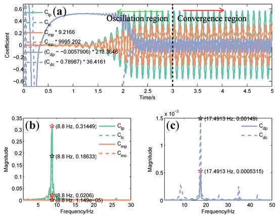 The fast Fourier transforms (FFTs) for various instantaneous coefficients are conducted as shown in Figure 5b,c. It is observed that the dominant frequency for lift and momentum coefficients is 8.8 Hz. This indicates that each instantaneous coefficient’s fluctuation is controlled by shedding vortices and hence they share the same frequency. However, since each vortex has the same contribution to the drag, ’s and ’s frequency is twice (17.49 Hz) that of lift coefficient.