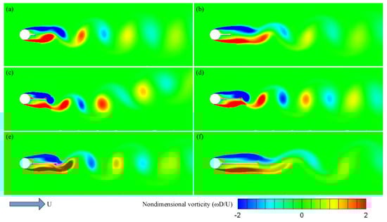 In order to investigate the influence of the plate length on the wake structure of the converter, contours of nondimensional vorticity for a variety of plate lengths at U = 1.7 m/s are illustrated in Figure 6. The wake shows a regular 2S vortex pattern (a single vortex is shed into the downstream in each half cycle) for varied splitter lengths, which means the plate has little impact on the far downstream wake. Shedding vortices cannot roll from one side to the other side along the cylinder’s rear surface due to the plate’s prevention, thus they are forced to process along the plate downstream. Therefore, with the existence of the plate, the shear layer is greatly influenced and extended to the tip of the plate, and the near-plate wake field is significantly rebuilt, which results in dissimilar shapes of lift force curves. Shedding vortices cannot attach to the plate for , and they reattach to the plate for longer s. Meanwhile, the vorticity magnitude is obviously smaller at compared with other cases, and vorticity contour becomes approximately symmetrical over the plate. Additionally, the reattachment of shedding vortices (Figure 6c–e) on the splitter leads to a counterflow along its surfaces, which also contributes to a larger negative-pressure region and higher pressure difference between two surfaces.