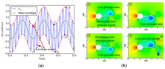 In order to show the variation of the wake structure at different design parameters, time-varying lift-coefficient and pressure-coefficient contours are presented in Figure 7 in comparison with that of another simulation case as shown in Figure 8. In order to compare variations of the wake structure, time-varying lift-coefficient and pressure- coefficient contours of two simulation cases with significant differences are presented in Figure 7 and Figure 8. It can be found that the variation of lift coefficient is obviously different from other simulation cases in Figure 7. Two dominant frequencies (Figure 7a) shape the varying lift force, while the upper/lower envelope and mean value oscillate synchronously with the same frequency, which is the major oscillating frequency of the lift coefficient. The minor frequency is produced as a result of the developing low-pressure area marching alongside one surface of the plate. Lift-force peaks are obtained when the low-pressure area reaches the tip of the plate (Figure 7b). Furthermore, the maximum of negative pressure is obviously greater for the case shown in Figure 7 than that shown in Figure 8, which determines its lift coefficient has a larger amplitude.