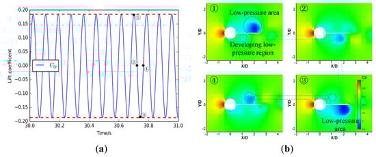 The lift force exerting on the plate is the summation of those acting on its lower side and upper surface. The existence of the splitter not only affects the lifts’ amplitude but also their phase. Pressure centers on each surface are obviously not equivalent and the maximum of negative pressure does not remain constant, as shown in the pressure contour (Figure 7 and Figure 8). This nonequivalence results in a fluctuating phase difference between the forces on lower and upper surfaces. Phase differences of lifts at different plate lengths are averaged and illustrated in Figure 9b. It can be noted that the phase difference of is remarkably greater than other cases, which could result in a lift coefficient of a small amplitude. The fluctuating phase difference and absolute pressure difference together shape the time-varying total lift on the plate.