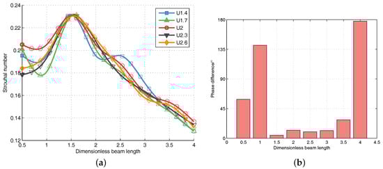 Influence of plate length on dimensionless shedding frequency (Strouhal number) is shown in Figure 9a. It reveals that the variation of Strouhal number obeys the same tendency for the selected Reynolds number range. It grows with the increment of the plate’s length for , though the tendency seems to be slightly diminished at around . All s reach a maximum of at , and this is also the condition when maximal RMS of comes up. This indicates that the shedding vortices are distinctly affected by their reattachment on the plate. decreases almost linearly with the growth of the plate’s length for .