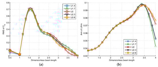 The amplitude of lift coefficient is characterized by its RMS value, and the variation of RMS of is presented in Figure 10a. It can be noticed that a sinking of exists at , which is caused by the wake being approximately symmetric at the plate’s upper/lower surface (Figure 6b) due to shedding vortices not adhering to its surfaces. RMS of reaches it peak at for different velocities, and it begins to decline due to the combined effect of the magnitude of negative pressure region on the plate (Figure 7 and Figure 8) and the phase difference between the lift on both sides (Figure 9b).