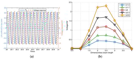 (a) and corresponding voltage response versus time for U = 2.6 m/s and ; (b) RMS of voltage response for different plate lengths under various velocities. All loads were 10 M.