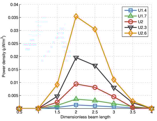 With the calculated output power from Equation (8), power density per sweep volume [], defined as power value divided by stalk’s volume (microwatt per cubic meter), is calculated and presented in Figure 12. The maximal power density reaches 0.035 W/m at and U = 2.6 m/s. Though it is quite small compared with those of Pobering and Schwesinger [] (theoretically 68.1 W/cm), Li et al. [] (2036 W/cm), Akaydin et al. [] (23.6 mW/m) and Vatansever et al. [] (157.9 W/cm for the PVDF layer, 9.67 W/cm for the PZT–single layer and 2.28 W/cm for the PZT–bimorph in the air), the VIPEC could be easily cascaded in a single mooring cable. Besides, the smaller lift coefficient on the cylinder makes the cable more stable. Periodical discharge from the storage circuit provides multiple purposes of the VIPEC.