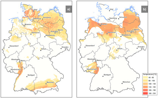Maps of the Geothermal Atlas of Germany [20] for measured (a) and inferred/indicated (b) hydrothermal resources and associated maximum temperatures.