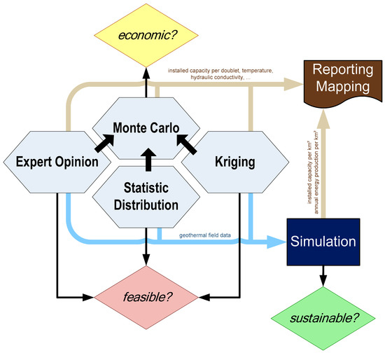 Statistic tools, methods, criteria, and workflows for geothermal resource and reserve assessment in Germany. Starting points are predictions of relevant parameters based on available data (pale blue hexagons). Expert opinion and Monte Carlo simulations can be used for mapping. Simulation models can be conducted for assessing output over time of single sites.