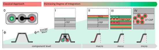 In this paper, two expressions are introduced and illustrated in Figure 2 helping to describe the functional integration characteristics of energy storages. Firstly, the scale of multifunctionalization refers to the geometrical organization levels of composite laminates. According to common definitions of the scales of observation (e.g., for observing damages [28]), the smallest scale is the microscale concerning all details of the heterogeneous structure (single fiber, fiber–matrix interface). The mesoscale represents the scale of the unidirectional single layer, and the macroscale concerns the overall laminate. Above that scale, structures made from fiber-reinforced laminates range on the component level. The second relevant expression, the degree of integration or multifunctionalization is used as a rough measure for the proportion a battery is integrated into a fiber-reinforced structure. Comparable to the efficiency measures defined by Wetzel [27], a conventional non-load-carrying battery corresponds to zero degree of integration (functional separation). A low level of multifunctionalization is reached by omitting non-energy-saving peripheral components (such as enclosures), by integrating the bare standard cells into a structure (e.g., aircraft omega stringer).