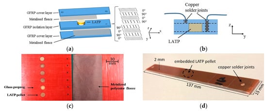 (a) Architecture of the LATP–GFRP composite; (b) electrical connectors; (c) core laminate with embedded LATP pellets; (d) four-point bending test specimen with bond points for electrical measurements.