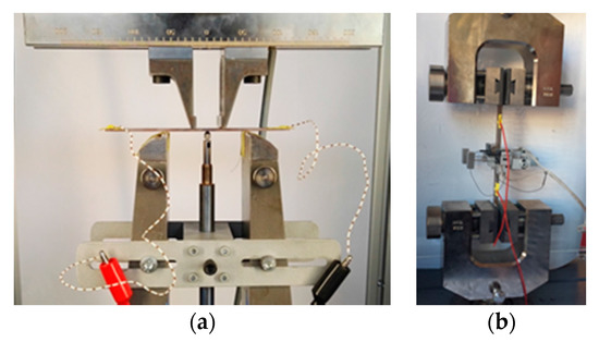 The mechanical properties were investigated by means of four-point bending tests (Figure 5a) and tensile tests (Figure 5b) using a universal testing machine (Zwick 1484, Zwick GmbH & Co. KG, Ulm, Germany). Both tests were conducted with a displacement rate of 1 mm/min and a preload of 5 N to ensure that the specimens were in a defined initial state. A 20 kN load cell (Z4, Hottinger Baldwin Messtechnik GmbH, Darmstadt, Germany) and a displacement transducer were used. The force and deformation were recorded with the testing machine specific software Test-Expert II V3.31 (Zwick GmbH & Co. KG, Ulm, Germany).
