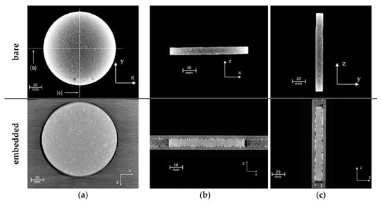 In order to investigate the quality of the LATP pellets and their embedding into the GFRP laminate, before-and-after CT scanning was conducted. Figure 6 depicts three cross sections (a–c) of a bare pellet (upper row) and after embedding into GFRP (lower row). Figure 6a shows the xy-cross section at half the thickness. No macrofractures, inclusions, or other voids could be seen in the bare pellet. However, the slight grayscale variation suggests a certain inhomogeneity of the composition. The two darker dots are artefacts of the specimen holder.
