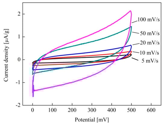 Cyclic voltammetry curves of the LATP electrical energy storage system are shown in Figure 7. The measurements were conducted at an ambient temperature of 24 °C, between potentials from 0 to 0.5 V and at a scan rate of 5–100 mV/s. In this potential range no visible peaks were observed, indicating the absence of faradaic current. This revealed that charge and discharge occurred reversibly at the Au–LATP interface. The curves were closer to a rectangular shape at lower scan rates (5–20 mV/s) and tended to tilt towards the vertical axis for scan rates above 20 mV/s. Because of the slow chemical process of ion diffusion, the material heated up with an increasing scan rate (ohmic behavior), which resulted in both a tilting graph and current peaks at the maximum voltage.