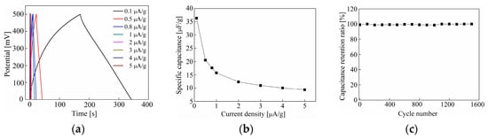 To investigate the storage ability of the LATP electrical energy storage device, galvanostatic charge–discharge measurements were conducted with multiple charge–discharge current densities from 0.1 to 5 µA/g (Figure 8a). Only a slight voltage drop caused by internal resistance could be observed at a charge–discharge current density of 0.1 µA/g during discharge. The specific capacitances were calculated from the discharge curves and plotted in Figure 8b. At values lower than 1 µA/g, the specific capacitance decreased rapidly with the increasing current density. At values higher than 2 µA/g, the specific capacitance asymptotically approached a constant value below 10 µA/g. The highest specific capacitance about 35.98 µF/g was reached at a current density of 0.1 µA/g. Regarding the charge–discharge tests it was observed that the mean capacitance remained constant during 1500 cycles (0–0.5 V, 2 µA/g), as shown in Figure 8c.
