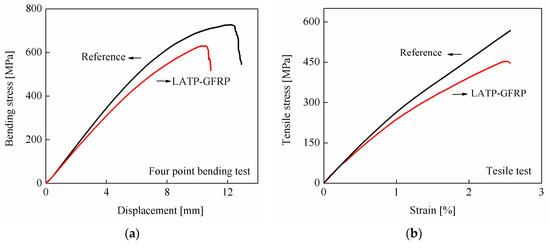 Figure 9a shows the displacement–stress curves of one representative specimen per type tested in the four-point bending tests. In the beginning, the bending stress was found to increase nearly linearly with the deformation, indicating a linear elastic material behavior. With increasing deformation, the stress–displacement behavior became non-linear before reaching the final rupture. Whereas the LATP-GFRP curve overlapped the reference curve at the beginning, the overall slope of the linear elastic range was slightly lower. Finally, with both maximum strain and stress at rupture being lower, failure occurred earlier compared to the reference specimen. The strain–stress curves gained in the tensile tests are depicted in Figure 9b. The whole reference curve tends to be a straight line, again indicating a linear elastic deformation behavior. The curve of LATP–GFRP is similar except for the lower slope and the lower tensile stress.