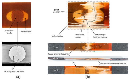 Figure 10 shows multiperspective damage state photographs of an exemplary tension specimen after mechanical testing. A prerupture photo (a) was taken at about 64% of the ultimate load to obtain an impression of the damage evolution. Front, back, and side views of the ruptured specimen are depicted in Figure 10b. It was observed that the delamination initiated at the tips of the pellet oriented in a longitudinal direction (a). The local delamination initiation and progression were caused by the stiffness mismatch of the neighboring materials, presumably a low interfacial adhesion and post-initiation shear-lag effects. In the picture, the pellet is presumably delaminated completely, although the dark square coinciding with the pellet does not indicate any delamination.
