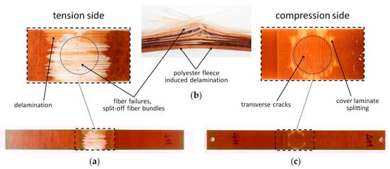 Concerning the four-point bending failure behavior, several similarities exist compared to the tension tests. Because of the symmetrical layup, it can be assumed that the bending neutral axis is located in the midplane of the specimen. Thus, the upper side compression and the lower side tensile stresses are assumed to be of comparable value. Again, three perspectives (tension side view, side view, compression side view) are illustrated in Figure 11.