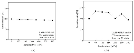 As illustrated in Figure 12a, the capacitance of LATP–GFRP decreased slightly (capacitance retention ratio changes from 98 to 93%) when the bending stress was increased from 120 to 600 MPa. The apparent capacitance degradation was, in fact, assumed to be caused by contact loss due to delamination between the metalized polyester fleece and the LATP pellet under bending loads.