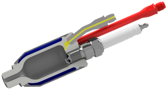 To study the influence of different ignition systems on combustion process in GMVH-12 engine, during the second stage of investigations the engine was equipped with scavenged ECO-JET prechamber. Accurate testing of these devices was carried out at Colorado State University [15,16]. The cross-sectional view of ECO-JET prechamber is displayed in Figure 2. The volume of PCC used in the current work is 38.9 cm3, which corresponds to 1.35% of the clearance volume. Initially the GMVH-12 engine was not designed for operation with a PCC ignition system. Therefore, systems are pre-assembled in place of one of the two spark plugs located in the cylinder head. These openings are positioned at an angle (Figure 3) so the gas emerging from the prechamber through the single hole is able to spread in a considerable volume of the main chamber.