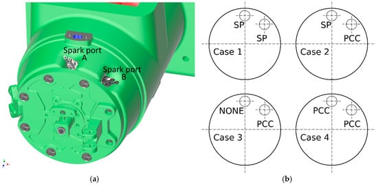 (a) Location of spark plug (SP) or pre-combustion chamber (PCC) in cylinder head; (b) Configurations of investigated ignition system.