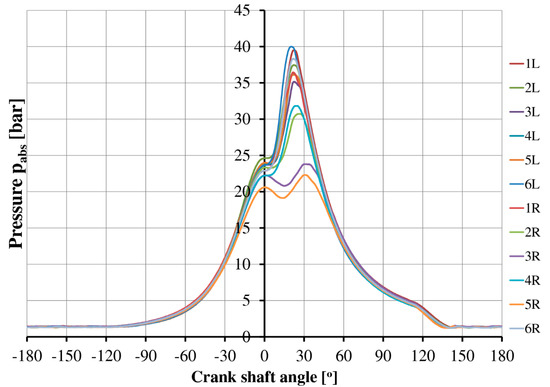 The example of combustion pressure distribution trends for 12 cylinders at 300 rpm rotational speed is demonstrated in Figure 4. For all tests, the coefficient of variation for engine before modifications COVE,I was calculated as the ratio of standard deviation of the main chamber peak pressures and the average main chamber peak pressure from 12 cylinders [23]. Main chamber peak pressure was designated on 10 work cycles from one engine cylinder. For each cylinder, a series of IMEP measurements were performed. Figure 4 displays indicated mean effective pressure for 12 cylinder of GMVH-12 engine.