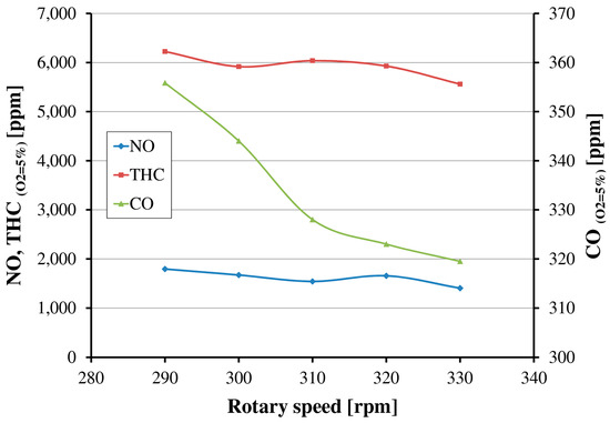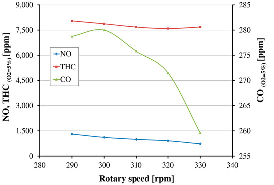 It can be observed that the values of all measured compounds decrease with an increase in the rotational speed. Nitric oxide emission is about 30% lower than presented by Rudkowski et al. [10] for two stroke gas engine GMVH-8 with EGR, but still four to five times higher than emission limits for new engines [7]. The gas analyzers for THC were calibrated using a mixture of CH4 and N2 as span gas, thus the displayed results for high hydrocarbons emission refer to molar fraction of methane in flue gases. The maximum value of THC (0.82%) was obtained for the rotational speed equal to 290 rpm which is about 7.8% of the total amount of fuel delivered to the engine. For other speeds, the average value was also on high level equal to 7.4%.