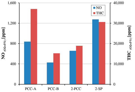 It can be noted that the most uniform combustion process inside the cylinder (the most uniform distribution of combustion pressure) was obtained for case with only one PCC in port B. The value of COVC is 1.4%, which is 20% lower than for two spark ignition configuration. The obtained values can be referred to results of Olsen and Lisowski investigations on single separated cylinder, where the COV has ranged from 10% to 25% depending on equivalence ratio in the prechamber [16]. For prechamber installed in port A the combustion instabilities increase. This phenomena could be explained by air-fuel mixture composition distribution in the cylinder, as near to the port A the stoichiometric composition is present. This conclusion is based on Computional Fluid Dynamics (CFD) calculation results of natural gas combustion process in GMVH-12 engine. It can also explain that more stable combustion, in comparison to 2-PCC case, occurs in 2-SP configuration, (COVC = 2.3 and 1.7 respectively for 2-PCC and 2-SP). Delivering of additional air to the PCC-B, results in increase intensity of misfiring (mixture is out of high flammability limits) and unburned fuel is injected to the main cylinder which influences the dose composition. The ignition occurs only for one PCC-A but not all fuel is burned. This hypothesis can be confirmed by analyzing the THC emission, as its value for PCC-A is higher than for test with only one PCC located in port B. The results of influence of ignition system on emission of toxic compounds for one cylinder are displayed in Figure 7.