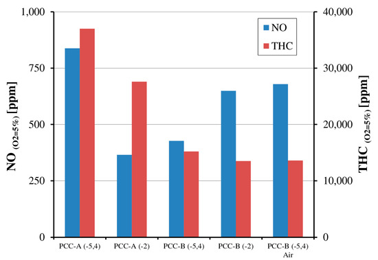 The explanation of increased THC emission can be that the back parts of prechamber and near piston wall regions are the place of unburned methane formation and increased emission. The temperature rise is repressed due to heat transfer to the cylinder walls causing incomplete combustion. Lean mixtures sitting beyond the flammability limits disrupt flame propagation and part of the mixture remains without burning, resulting in increased hydrocarbon emission [25].