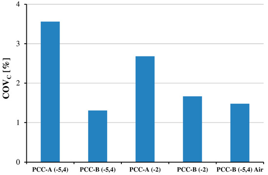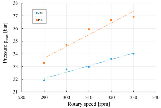 The emission of THC rose by around 25% for all examined rotational speeds and causes the increase of the specific fuel consumption value parameter to 0.291 Nm3/kWh. In comparison to tests with 2-SP ignition configuration, the gi increased by around seven percent, which means a roughly 2.2% reduction of fuel conversion efficiency. Similar results were obtained by Roethlisberger and Favrat [24], where the comparison of operating parameters of natural gas powered engine equipped with prechambers and spark plugs was realized. Increase of THC emission can suggest the drop of combustion stability. Although the calculated values of COVE,II coefficient decreased for all investigated rotational speeds. The value of COVE,II is in the range from 9.9 up to 12.4 with an average value of 10.8 (11.7 for engine with 2-SP). This means that PCC ignition system improves combustion stability by eight percent compared to 2-SP system. In Figure 11, a comparison of maximum peak of pressure for the whole engine with two investigated ignition systems is presented.