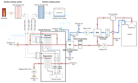 Schematic diagram of an existing liquid desiccant and evaporative cooling-assisted 100% outdoor air system (LD-IDECOAS) [].