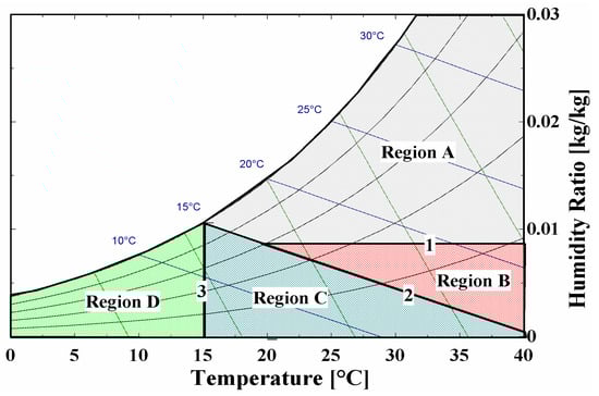 According to previous research [], the operating modes of the LD-IDECOAS are determined by considering the thermodynamic OA conditions on the psychrometric chart. The air conditions on the psychrometric chart are separated into four regions, as shown in Figure 2. There are three lines that compart the chart into four regions. Lines 1 and 2 stand for the humidity ratio and the wet bulb temperature lines at the supply air (SA) set point, respectively. Line 3 represents the dry bulb temperature line at the SA set point. Table 1 is the summary of operation modes of each system component under a given operational OA region.