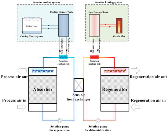 A liquid desiccant unit is composed of an absorber, a regenerator, a sensible heat exchanger, a solution heating coil, and a solution cooling coil. In the absorber, the strong solution dehumidifies the entering process air. This dehumidification process is an exothermic process; thus, the strong solution should be cooled by the solution cooling coil before entering the absorber. The weak desiccant solution leaving the absorber should be delivered to the regenerator after it is heated by the solution heating coil up to the regeneration temperature. Both the dehumidification and regeneration processes are repeated in the LD unit during the operation, and the driving force of moisture transfer to and from the desiccant solution is the vapor pressure difference between the desiccant solution and the air passing through the solution in the absorber or in the regenerator []. In general, the weak desiccant solution that enters the regenerator should be heated to 45–80 °C for the regeneration process, whereas the strong solution entering the absorber should be cooled down to 15–30 °C for the dehumidification process [,,,,]. To reduce the energy consumed in solution cooling and heating, the solutions that leave the absorber and regenerator are preheated and precooled, respectively, by the sensible heat exchanger. The solutions leaving the sensible heat exchanger are heated and cooled in the heating and cooling coils, respectively, and a gas boiler and a chiller are generally used to treat the required solution heating and cooling loads in the coils. A packed-bed tower type absorber and a regenerator are commonly used []. A conventional liquid desiccant system with a gas boiler and a cooling tower to treat the required solution heating and cooling loads in the coil is used in this study as a reference system for comparing the system performance and energy consumption with a heat pump driven liquid desiccant system (Figure 3).