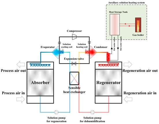 Schematic diagram of the heat pump driven liquid desiccant (HPLD) system.