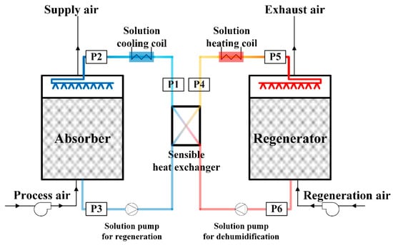 By considering the energy balance at the regenerator side, the enthalpy of the desiccant solution at the state point P6 can be estimated by Equation (20), under the assumption that the heat required for the endothermic process of regeneration is transferred from the desiccant solution [].