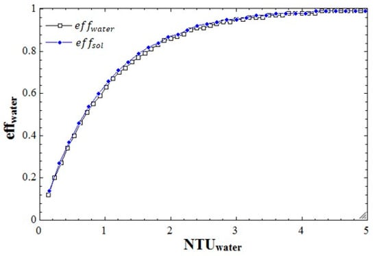 In the research conducted so far, there is no available model for predicting the performance of a water–water heat pump. The most similar model is Jin’s water–water curve fit model. After examining the model with theoretical analysis, we concluded that the model can be used as a solution–solution heat pump; mechanical relations of fundamental thermodynamic laws and heat transfer correlations are employed in the modeling procedure. To analyze the possibility of the model usage as a solution based heat pump, the heat exchange effectiveness in the evaporator and condenser was examined. Using the theoretical equations depicting the effectiveness of the evaporator and condenser, two cases of evaporator effectiveness when using water and solution have been compared by adjusting number of transfer units (NTU) value from 0.1 to 5, and the typical NTU values used in the study (0.13 to 2.05) are within the range. Results are shown in Figure 6 and it was found that there was not much difference between the two. Similar results were also found at the condenser side.