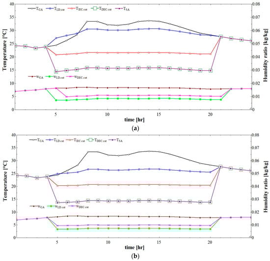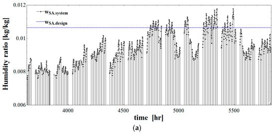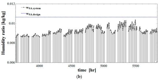 SA humidity ratio in the systems in the summer season. (a) SA humidity ratio of the conventional LD-IDECOAS; (b) SA humidity ratio of the proposed HPLD-IDECOAS.