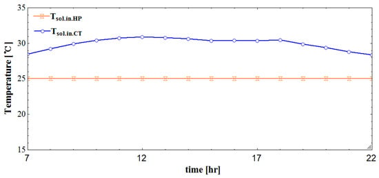 Furthermore, the desiccant solution at lower temperature also provides an advantage in terms of the process air temperature leaving the LD. As can be seen in Figure 7, the temperature of the dehumidified air leaving the LD in the HPLD-IDECOAS was 3–4 °C lower than that in the conventional LD-IDECOAS.