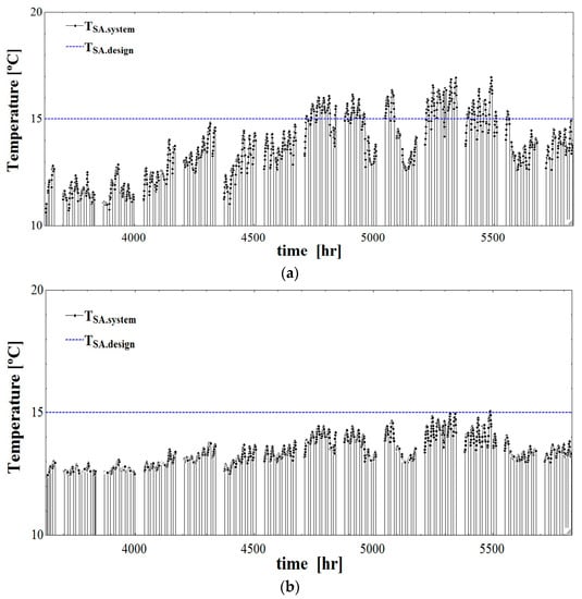 Figure 9 and Figure 10 show the hourly supply air temperature and humidity ratio variations in both systems during summer operation (i.e., from June to August). The dotted lines in the figures indicate the recommended temperature and humidity ratio of the supply air, which are 15 °C and 100% relative humidity. As can be seen in both Figure 9 and Figure 10, the HPLD-IDECOAS always maintains both the supply air temperature and humidity ratio lower than the recommended level. On the contrary, the reference system (i.e., the LD-IDECOAS) showed that the supply air temperature and humidity ratio exceeded the recommended conditions in a certain period of time (i.e., from 4750 h to 5500 h) when the outdoor air was too hot and humid. The reason for this observation is as follows. In the HPLD-IDECOAS, the desiccant solution temperature entering the absorber is maintained at 25 °C by the heat pump, and thus, the dehumidification performance of the absorber is not affected by the outdoor air condition. Consequently, the desirable supply air condition can be maintained even under hot and humid outdoor air conditions. However, in the LD-IDECOAS, the desiccant solution temperature entering the absorber should be passively controlled by the water-side free cooling with the cooling tower, whose cooling capacity is highly affected by the wet-bulb temperature of the outdoor air. When the outdoor air is hot and humid, the wet-bulb temperature is too high and the desiccant solution entering the absorber cannot be sufficiently cooled to provide adequate dehumidification of the supply air. This results in undesirable supply air temperature and humidity ratio, which exceed the design levels, as shown in Figure 9.