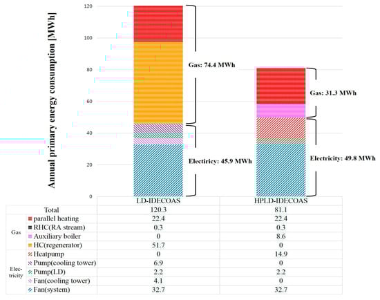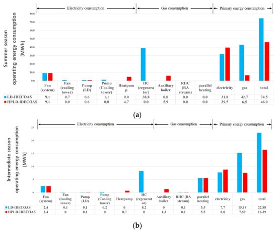 Figure 11b shows the operating energy consumption of both systems during the intermediate season. Because there was demand for liquid desiccant dehumidification even during the intermediate season, it can be seen that the HPLD-IDECOAS saved 50% of the gas consumption for regeneration of the desiccant solution, compared with the LD-IDECOAS. The proposed system consumed more electrical energy than the conventional system because of the heat pump operation, but this penalty was offset by the reduction in gas consumption. Consequently, the HPLD-IDECOAS showed 29% primary energy saving over the conventional LD-IDECOAS during the intermediate season.