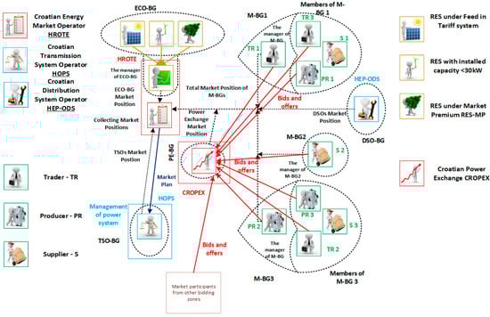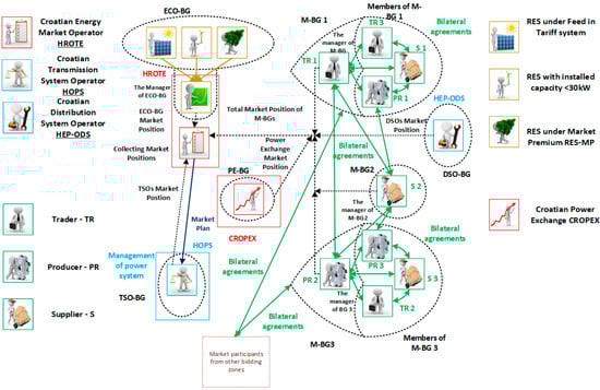 The concept of the bilateral electricity market in Croatia is presented in Figure 3. Black dotted lines represent BGs. Figure 2 contains M-BG (M-BG 1–3), DSO-BG, TSO-BG, PE-BG and ECO-BG. In each BG, the manager is specifically denoted. Black dotted lines with arrows represent market positions that the manager of each BG sends to HROTE. Green lines with arrows represent bilateral arrangements between market participants, which can be members of the same or any other BG. Market positions, which HROTE sends to HOPS to verify their technical feasibility, are represented with blue arrows.