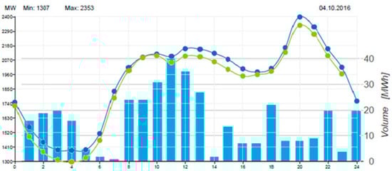 During the first 100 days of trading, only 100 GWh of electricity was traded over CROPEX, which means that its liquidity was less than 2% []. Figure 3 shows that on 4 October 2016, the liquidity of the CROPEX was only 0.84%. The blue bars in Figure 3 represent traded volume of electricity at each trading hour. Trading hours are marked on x-axis with numbers 0–24, while traded volume of electricity in MWh is indicated on y-axis located on the right-hand side of Figure 3 with numbers 0–40. The blue and green curves represent forecasted and actual demand. Demand level is indicated in MW on the left-hand side of Figure 3 with numbers 1300–2400. If we compare the liquidity of CROPEX with Nord Pool, which has liquidity beyond 90%, it is obvious that CROPEX is still not a well-functioning market and additional analyses and development strategies should be performed [,,]. However, CROPEX is a small national power exchange, while Nord Pool represents a regional power exchange, which is one of the reasons for such a difference in liquidity between them.