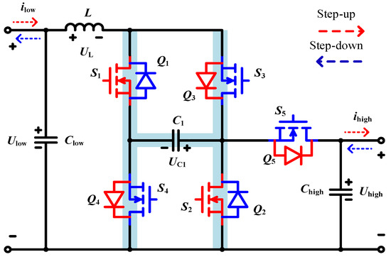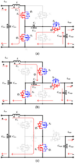 When S3S4S5 = 111: The switching state is shown in Figure 5a, where switches S3, S4, and S5 are ON. The anti-parallel diodes of Q1 and Q2 are forward biased. The high-voltage side Uhigh and capacitor C1 charge the inductor L, and simultaneously provide energy to the load in the low-voltage side. The current iL rises linearly.