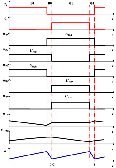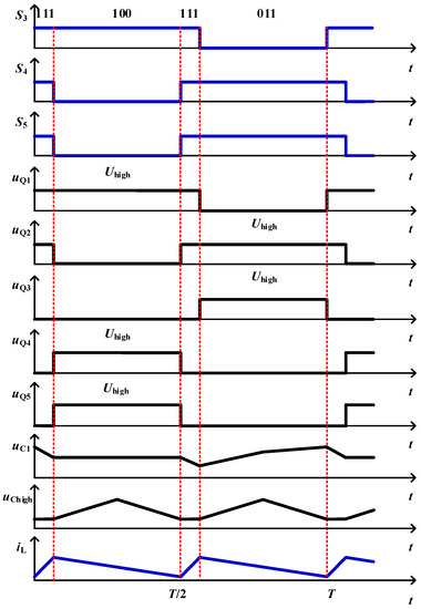 As shown in Figure 2, Uhigh can be stepped down to Ulow by controlling the power semiconductors Q3, Q4, and Q5. The relationship between d3, d4, and d5 can be written as d3 = d4 = d5 = dBuck, where d3, d4, and d5 are the duty cycles of Q3, Q4, and Q5, respectively. The phase difference between the gate-driving signals S3 and S4 is 180°. The gate-driving signal S5 = S4. During one switching period, the converter has three switching states, and their sequence is “111-100-111-011-111”. Figure 5 shows the energy flow paths and Figure 6 shows the typical waveforms. During each switching period, all of the power semiconductors also turn on and off once.