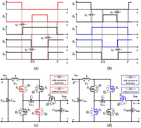 The synchronous rectification operation principle of the proposed converter is shown in Figure 7. Figure 7a shows the gate signals of S1–S5 in step-up mode and Figure 7b shows the gate signals of S1–S5 in step-down mode. In step-up mode, the current has to fully flow into the corresponding anti-parallel diodes of the slave power switches Q3, Q4, and Q5 at the dead time td. When the slave power switches are ON, the current almost flows into the MOSFETS due to their lower on-resistance as shown in Figure 7c. In step-down mode, the current flow path is the same as with the step-up mode as shown in Figure 7d. The only difference is that the slave power switches are Q1 and Q2.